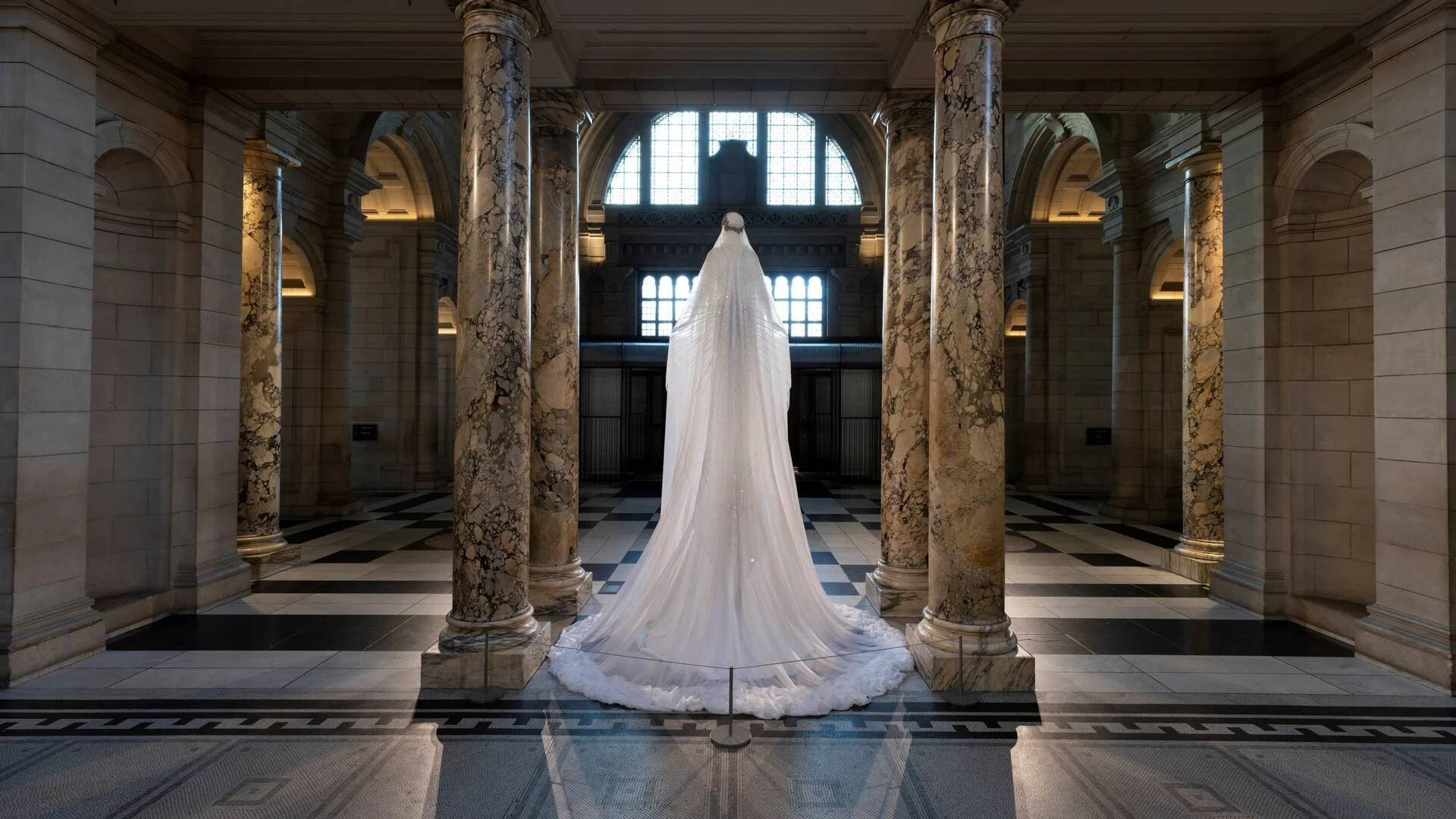 For the V&A Christmas Tree installation in 2022, Miss Sohee joined a distinguished lineage of guest designers—including the likes of Alexander McQueen—when she was invited to reimagine the museum’s annual Christmas tree. Interpreting the festive icon as a dramatic couture ensemble, she transformed it into a three-metre veiled figure inspired by the religious statuary found throughout the museum. The installation featured a silk chiffon cape layered over a crepe de chine gown, intricately embellished with star-inspired embroidery and Swarovski crystals.
